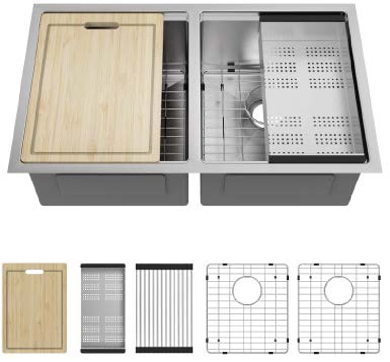 18 Gauge Stainless Steel Undermount Kitchen Sink Double Bowl Deep Basin Material: T-304 Stainless Steel 18Gauge Stone Guard Undercoated Satin Finish